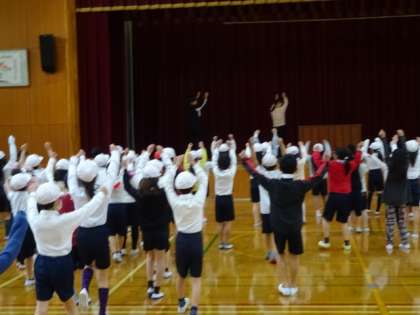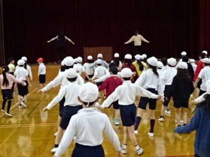 4年生は6月に早くも宿泊学習に行きます。それに向けて最初の体育の学習では,学年みんなでキャンプファイヤーで踊るダンスの練習をしました。先生の見本を見ながら踊っているうちに少しずつ覚えていきました。