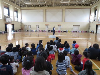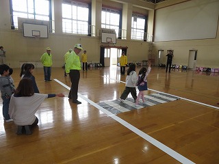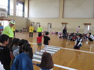 お話のあとは,実際に道路を渡る練習をしました。体育館に歩道を作っていただき,右と左を確認しながら渡りました。車が来たときは,待ち,通り過ぎてからもう一度確認をして渡ることができました。