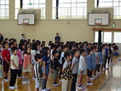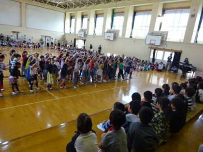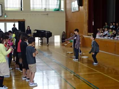 <2枚目>3年生の出し物「友だちの歌」…学校のよさをたくさんの「C]で見つけてくれました。