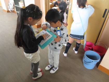 生活科の学習で,9日に2年生と学校探検をしました。クラスのみんなと回った時とは違い,ひとつひとつの教室を詳しく説明をしてもらったり,マップにシールを貼りながら回れたりしたので,とても楽しかったようです。「とても優しいお兄さん,お姉さんだったよ。」と,うれしそうにしていました。