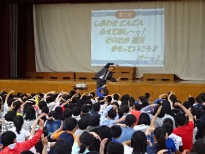 「しあわせ どんどん ふえてほし〜っ!そのため 憲法 守っていこう!!オーッ!!」