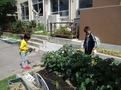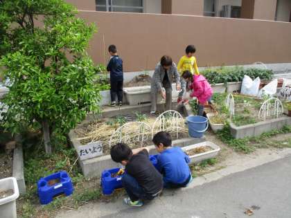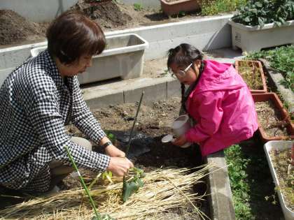 当番を決めて,毎日畑や花だんの水やりをしています。