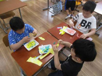 生活班に分かれて,和紙をちぎり,鯉のうろこ作りの続きをしました。