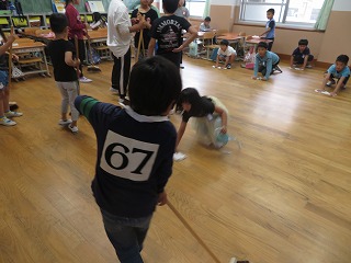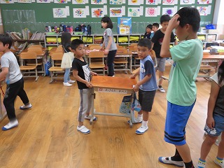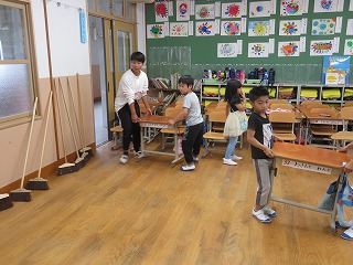 おそうじを練習しています。6年生のお兄さん,お姉さんにぞうきんやほうきの扱い方を教えてもらい,もくもくと掃除に取り組んでいます。教室に帰ってきた友だちに,「すごいピカピカや!」と言ってもらい,とても嬉しそうにしていました。