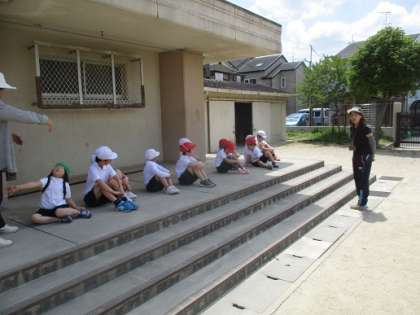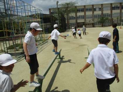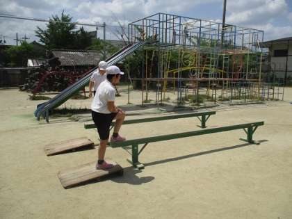 平均台やミニハードルなどの器具を使って体つくり運動をしました。