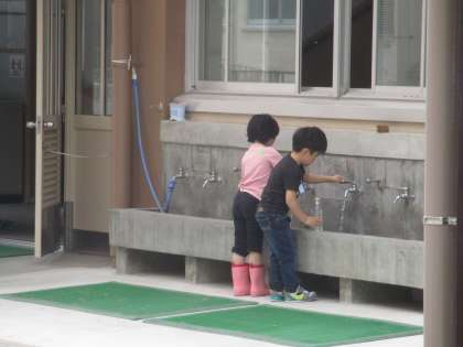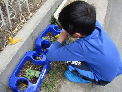 生活科の時間に育てているアサガオを,大雨に備えていったん避難させました。
