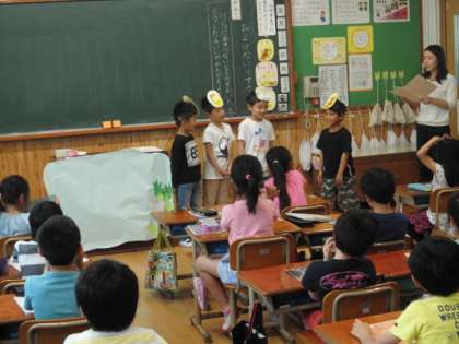登場人物の気持ちを知るために,数人にかめ・白鳥・あひる・りすの役割を演じてもらいました。