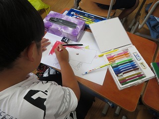 算数科の学習で,さまざまな形があることを知りました。今日はその形を写し,絵を描きました。箱の写し出す面によって,いろいろな形があります。形から想像できるものを考え,思い思いに描いていきました。