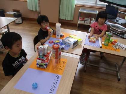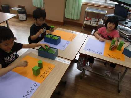 重なるかどうか,立体模型や空き箱などを使って分類しました。