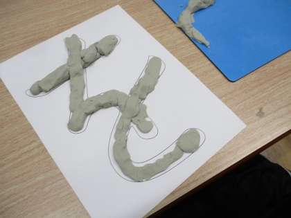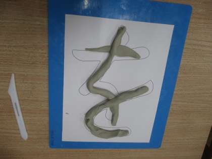 ひっつきの「を」の字形をとらえるため,粘土を使ってみました。