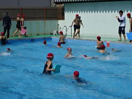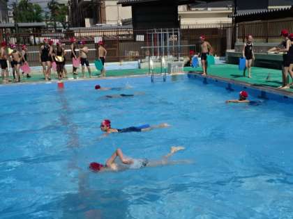 体育科の水泳の学習では,6年生になって初めての学習を行いました。授業の流れを確認しながら,水慣れから始めました。ビート板を使いながら感覚を取り戻している子もいました。自分の記録や新しい泳ぎ方に挑戦できるように取り組んでいます。