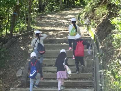 1日目午後の活動は「浦山追跡ラリー」。10文字の暗号を探して所内を回ります。制限時間もあり,班で協力しながら自然を満喫して歩き回りました。