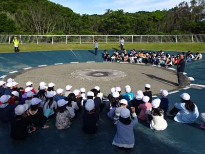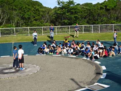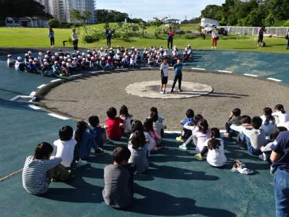 午前7時から,共同利用している松ヶ崎小学校と合同で,朝の集いを行いました。まずは校歌を歌い,その後は学校紹介です。鏡山に伝わる歴史や学校の様子を代表の2人が紹介してくれました。また,左京区にある松ヶ崎小学校の学校や地域の様子も興味深く聞いていました。