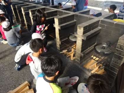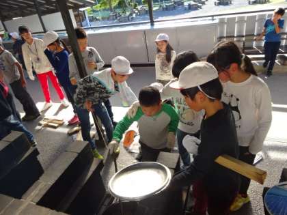 午後の2つ目の活動は野外炊事でした。メニューはハヤシライス。包丁を使って慎重に玉ねぎを切っていました。また班で協力しながら準備をしつつ後片付けも少しずつ行い,要領よく作っていくことができました。調理ができたらいよいよかまどで煮込みます。薪のロスが少なくなるよう,かまど係が考えながら火の調節をしていきました。そして完成です。出来上がった時の子どもたちの笑顔が印象的でした。きっと,みんなで協力して作ったから達成感を感じられたのかな〜。