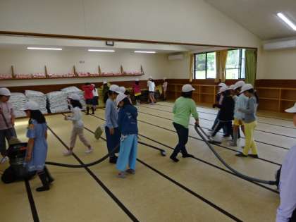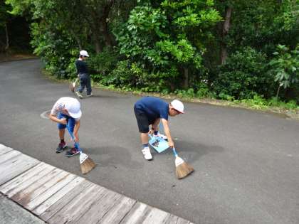いよいよみさきの家での生活も終わります。最後に使った場所の掃除をしました。男子は昨日寝たバンガローを,女子は90畳の掃除をしました。みんながてきぱきと動き,掃除後はそれぞれの場所がすっかりきれいになりました。
