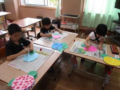 あじさいの花にのりをつけ,画用紙にはりつけました。