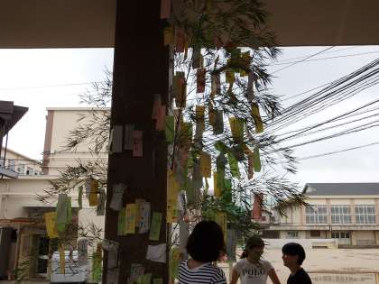 2日(火),地域の方からいただいた笹にPTAの方々が短冊を飾り付けてくださいました。