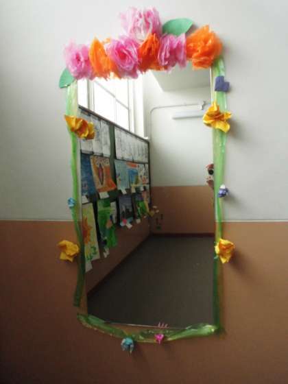 かべにかけてある,どこか寂しい空間の中にあった鏡が,まるで鏡の中に入ることができそうな魔法の鏡に変身しました。花紙を用いて,彩りを加え楽しい空間を作ることができました。