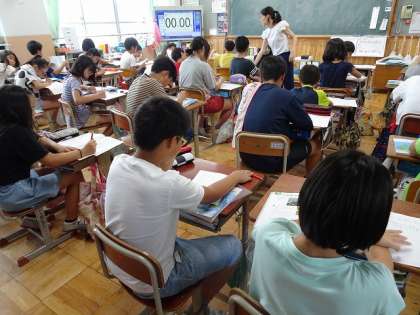 算数科の学習では,たしかめ問題に挑戦しました。今までの学習で習ったことを発揮しようと取り組みました。友だちと解答用紙を交換して丸付けを行いました。