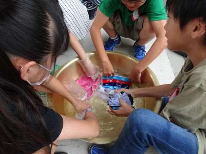 家庭科の「手洗い洗濯」の学習で,自分たちでもってきたハンカチを使って手洗いをしました。洗濯板を用いてゴシゴシ力を入れて洗いました。しゃがんで行うので,「足がしびれた」,「腰が痛い」と子どもたちは言っていました。また,洗い方にも種類があることに驚いていました。