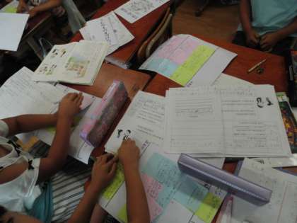 今,国語では「はじめ・中・終わり」の組み立てを考えて文章を書く学習をしています。組み立てを意識して書くとわかりやすい文章になることや,教科書や絵本の文章は,「はじめ・中・終わり」で作られていることに気づいて自分たちの文章に活かそうと工夫していました。