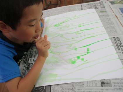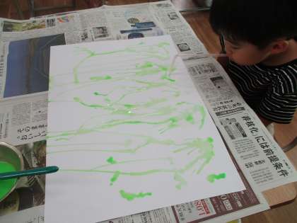 パスや絵の具を使って,お話の中に出てくるトラを描いています。