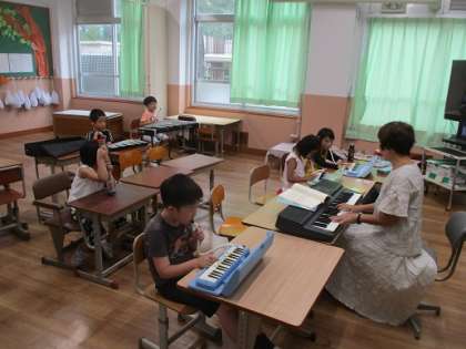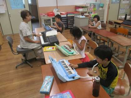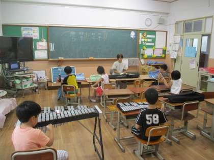 分担を決めて,歌のリズムに合わせて楽器をタイミングよく使う練習です。