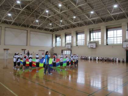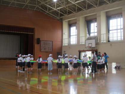 運動会に向けて,3年生のお友だちと一緒にパラバルーンの技の名前を覚えたり,練習をしたりしました。