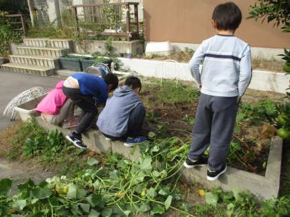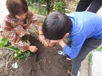 つるを引っ張ったり,土を掘り返したりしながら,たくさんの大きなお芋を収穫することができました。