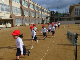 体育科の学習では,マラソン大会に向けて走る練習をしています。50m走の時とは違い,同じペースで長い距離を走る練習です。今日は5分間走をしました。途中で歩くことなく,最後まで走りきる人が多く,頑張りが伝わってきました。頑張りカードに走った数を溜めていくことを目標に,休み時間にもグラウンドを走って頑張っているようです。
