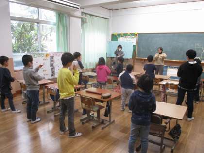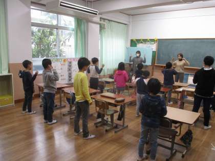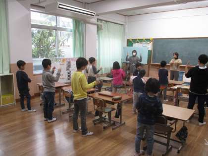 手話の意味についてお話してもらい,相手に伝わるようにするために,どのように手を動かせばよいか考えて取り組んでいます。