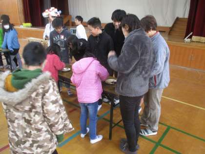 たいよう学級,1年生,2年生が体育館に集まって,豆つまみ大会が行われました。
