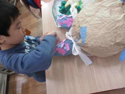 袋に新聞紙などをつめた立体作品作りをしています。