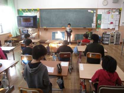 1年生の国語科の学習のまとめとして,たぬきの糸車の音読をみんなに聞いてもらいました。