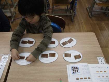 家族や友達と一緒にいる場面をイメージしながら具体物の操作を行いました。