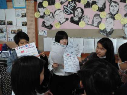 学習の最後には、クラスで8グループの旅行会社をつくり各国の宣伝をしていました。
