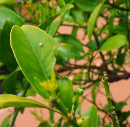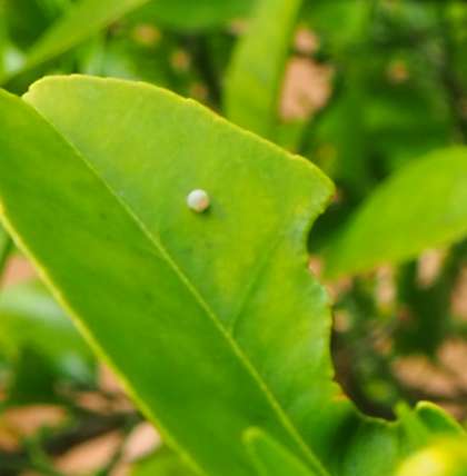 学校の中庭にある,夏みかんの木の葉にたまごを見つけました。