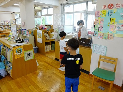 今日は図書室へ行って,学校司書の先生から図書館の本の扱い方や本の借り方・返し方を教えてもらいました。