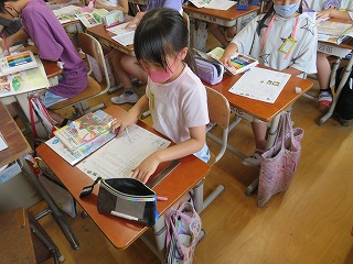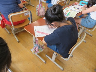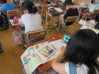 図画工作科の学習で,段ボールを使って,オリジナルの箱を作ります。今日は,どんな材料で,どんな箱を作るか,設計図をかきました。蓋の構造を工夫したり,材料を工夫して飾り付けを計画していたり,色々なアイディアが揃いました。