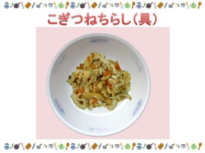 「こぎつねちらし(具)」はお酢を使ってさっぱりと仕上げています。これからの暑い時期にぴったりの献立です。ぜひ,おうちでも試してみてください。