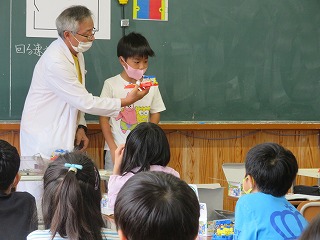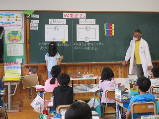 一人で実験を行った後は,結果を交流しました。モーターには,プロペラがついているので,直列つなぎの方が髪の毛がよくなびいていたことから,直列つなぎの方が電池の働きが強いことが分かりました。