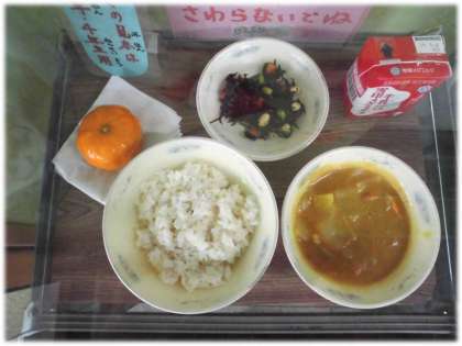 今日の給食は麦ごはん,牛乳,チキンカレー,ひじきのソテー,みかんです。カレーはとても人気のあるメニューで,何日も前から楽しみにしている様子でした。ひじきのソテーにはミックスビーンズ(大豆,金時豆,手亡豆,枝豆)が入っています。いろんな色や形をした豆を確認しながらおいしくいただきました。