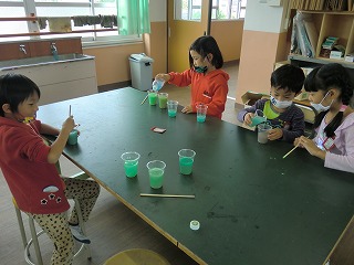 緑色でも少しずつ色のちがう緑の色水ができた班は