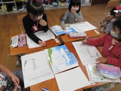 今日は,くじらぐもの上に乗ることができた子どもたちが雲の上でどんな話をしているのか話し合って,挿絵の吹き出しに考えを書きました。