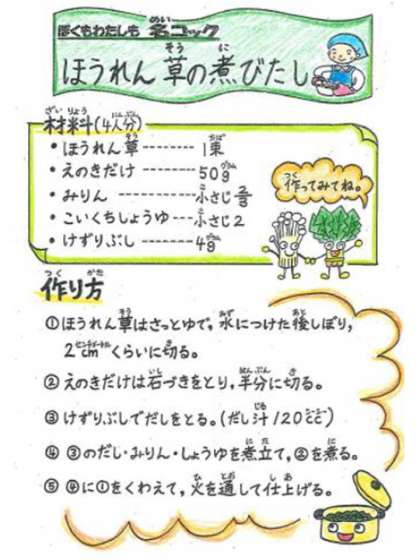 また,副菜の「ほうれん草の煮びたし」もとても人気で,作り方を教えてほしいという声がたくさん聞こえていました。ぜひ試していただければと思います。