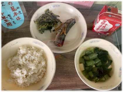 今日の給食は麦ごはん,さんまのかわり煮,だいこん葉のいためもの,とうふの吉野汁です。大きな釜で煮たさんまはやわらかく,味がしみ込み,とてもおいしかったです。2年生の教室では,みんなでさんまの骨の取り方を確認しながら,上手におはしを使って骨と身に分けて食べていました。ご家庭でもぜひおはしのもちかたを確認してあげてください。