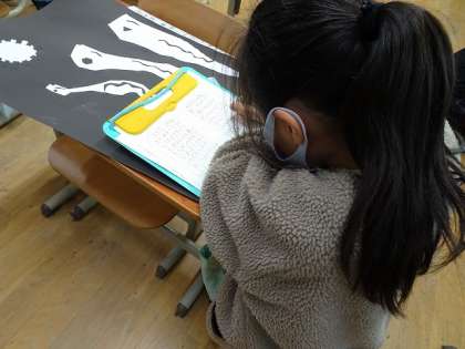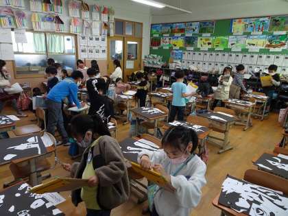 本日,図画工作科の時間に「はさみのアート」の学習で作成した作品の鑑賞会を行いました。無作為に切った紙を使って作品を作り上げ,「この紙は,恐竜に見える」など想像を膨らませていました。