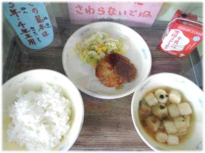 今日の給食はごはん,牛乳,トンカツ,野菜のソテー,みそ汁です。1年生は初めてのトンカツ,6年生は最後のトンカツです。献立表がくばられたときからみんな楽しみにしていました。