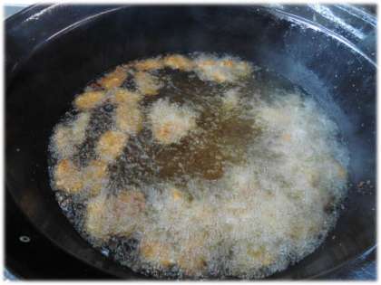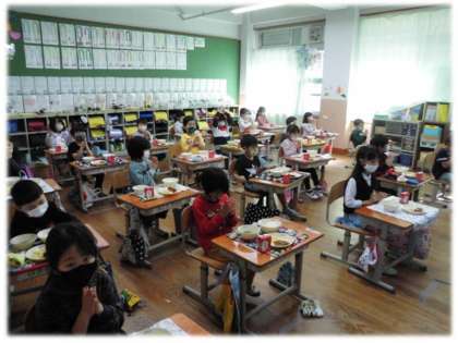 学校のトンカツは1まい1まい衣,パン粉をつけ,釜で揚げます。「学校全体で500枚以上揚げているんですよ」という話をすると,みんな驚いていました。1年生の教室をのぞいてみるとわくわくした様子で「いただきます」をして,おいしそうに食べていました。