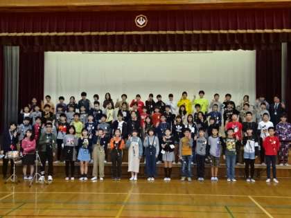 音楽発表会の後,体育館で集合写真を撮りました。みんな達成感溢れるいい顔をしていました。